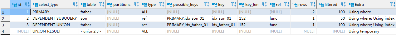 explain select * from (select f.id as father_id from father f union select s.id as son_id from son s) temp