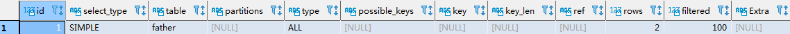 这两个查询中,条件都是一样,但是第一个返回的是所有列,而索引idx_father_02上仅包含主键列跟索引键值,故需要再根据主键的值去PK树上找到对应的列,这个操作称为回表,所以第一个查询中extra没有USING INDEX,而第二个查询有。
